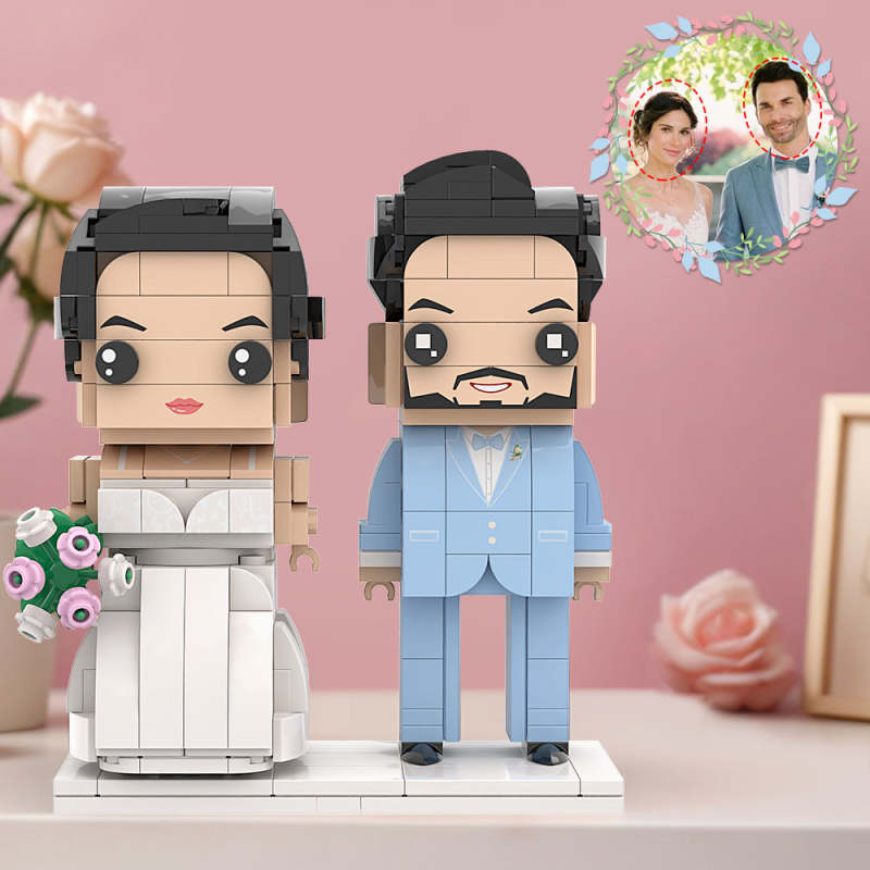 Costume Bleu Clair Avec Corsage Et Robe De Mariée Blanche-neige Couple De Figurines En Brique Figurines De Brique De Tête Personnalisées Petit Bloc De Particules Pour Souvenir D'anniversaire De Mariage